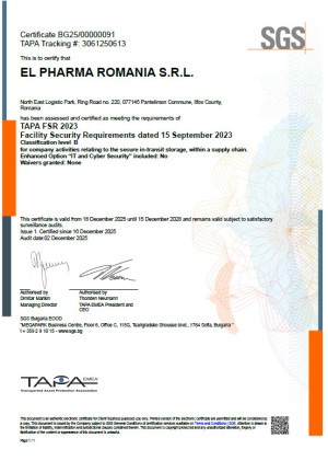 This certification is granted following a thorough audit, which confirms that EL PHARMA Romania complies with TAPA requirements regarding: